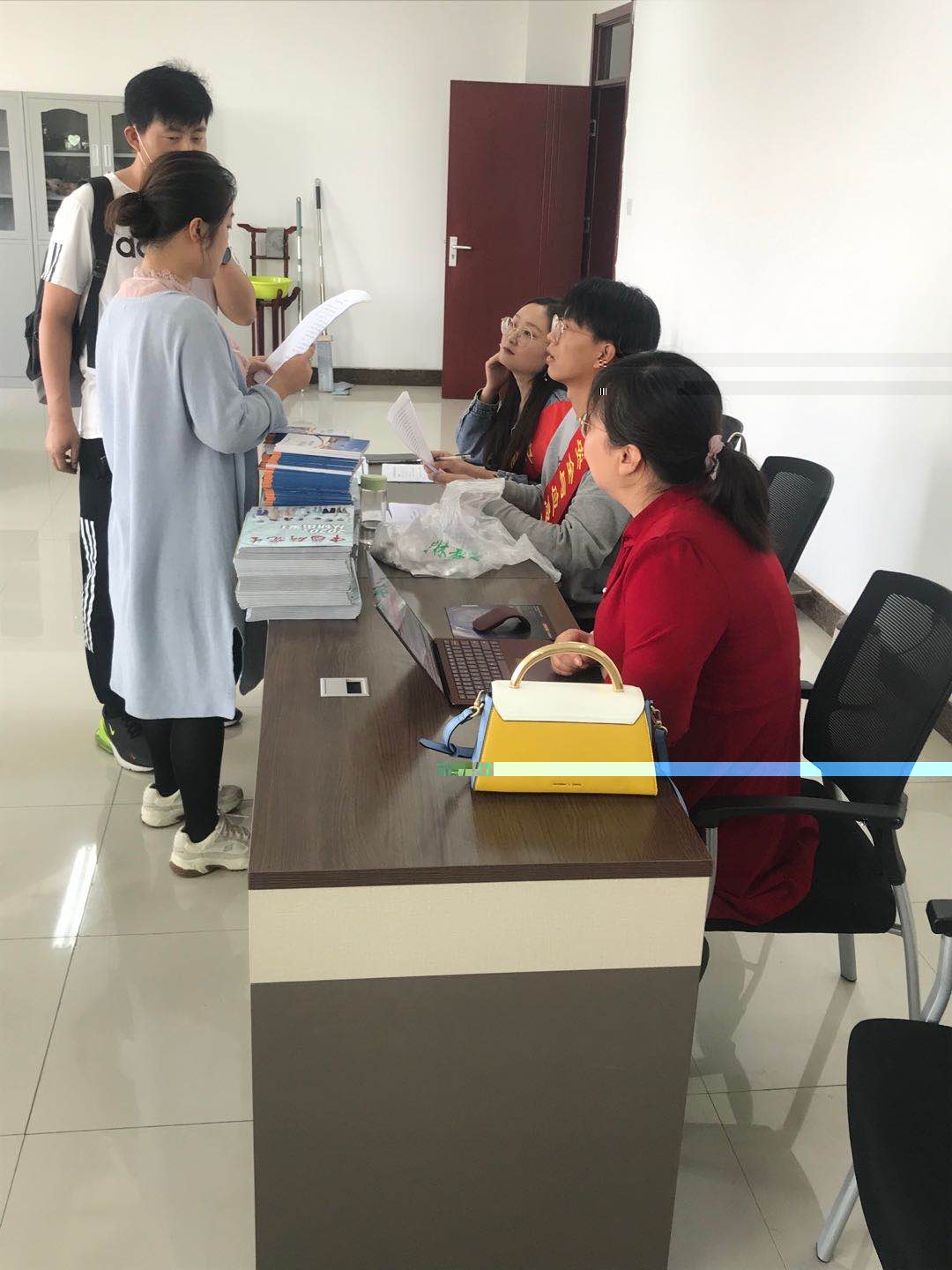 學(xué)院在科技樓九層設(shè)立新生報(bào)到處。核實(shí)新生錄取通知書、畢業(yè)證和身份證等身份信息,收取個(gè)人檔案,為新生發(fā)放開學(xué)的相關(guān)材料,以及辦理注冊(cè)手續(xù)等。工作人員默默的忙碌著,分工明確地完成各項(xiàng)報(bào)到流程,細(xì)緻周到,高效迅速,為新生介紹自己的院系,充分展示了學(xué)院的魅力。在學(xué)校各入口處都有迎新志願(yuàn)者的身影,志願(yuàn)者的親切引導(dǎo),熱情服務(wù),讓新生有一種家的溫暖,也正是這群可愛的志願(yuàn)者,使新生的報(bào)到更加安全有序,使各項(xiàng)工作順利進(jìn)行。