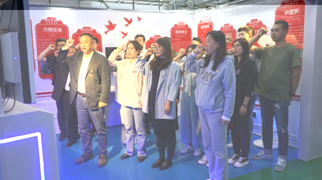 在黨建教育“智慧展廳”,同志們借助VR設(shè)備全方位、立體化的感受了中國共産黨建黨以來的光輝曆程,互動式地體驗了紅軍爬雪山過草地的艱辛,沉浸式投影和立體影音技術(shù),打破了傳統(tǒng)學(xué)習(xí)教育的時空限制。在“三晉先鋒”的朗讀亭、留聲牆,部分教師深情朗誦,贊美祖國之情溢于言表。在鮮紅的黨旗下,黨員同志們莊嚴(yán)地舉起右手,握拳宣誓,重溫入黨誓詞。
